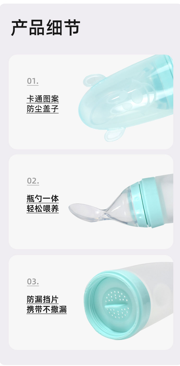 多功能性:除了作為勺子使用外,本產(chǎn)品還配備有可拆卸的瓶身部分,可作為小容量奶瓶或水杯使用,實(shí)現(xiàn)一物多用,方便實(shí)用。