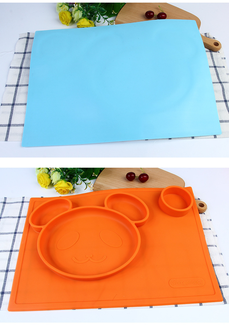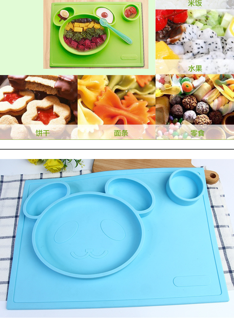 特點:二合一設(shè)計,防水、實用、方便,餐盤+餐墊一體式設(shè)計,餐墊可直接吸附在桌面上,熊貓造型,增加孩子的食欲,容量設(shè)計合理,防止兒童小手打翻。