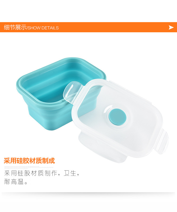 2、可折疊設(shè)計,利用硅膠的柔韌特性設(shè)計出可以折疊的飯盒,方便收納的貼心設(shè)計
