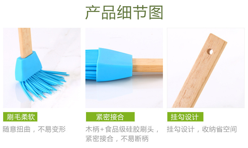 2、緊密結(jié)合,木柄+食品級硅膠刷頭,緊密結(jié)合,不易斷柄